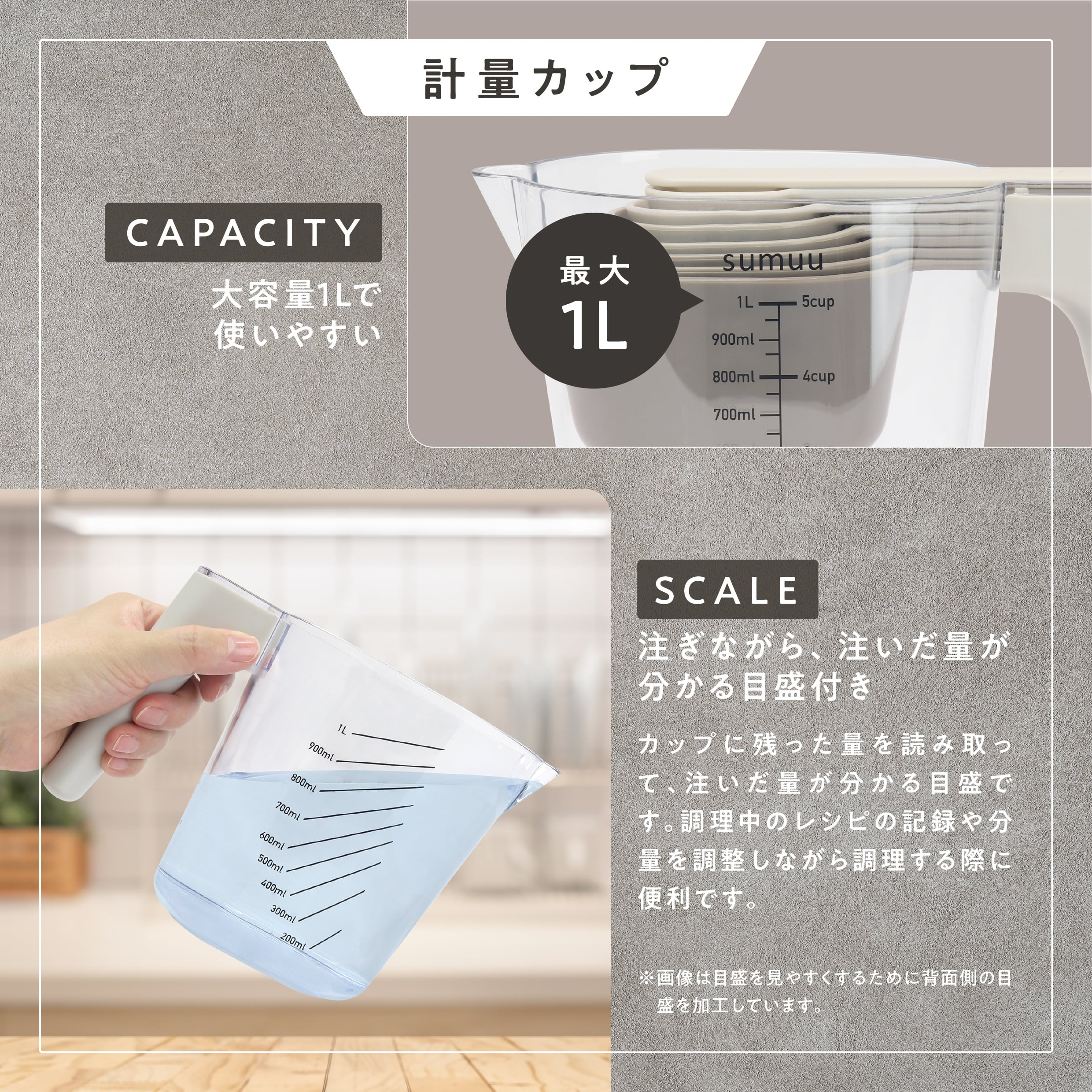 計量カップは、注ぎながら注いだ量がわかる目盛付き。