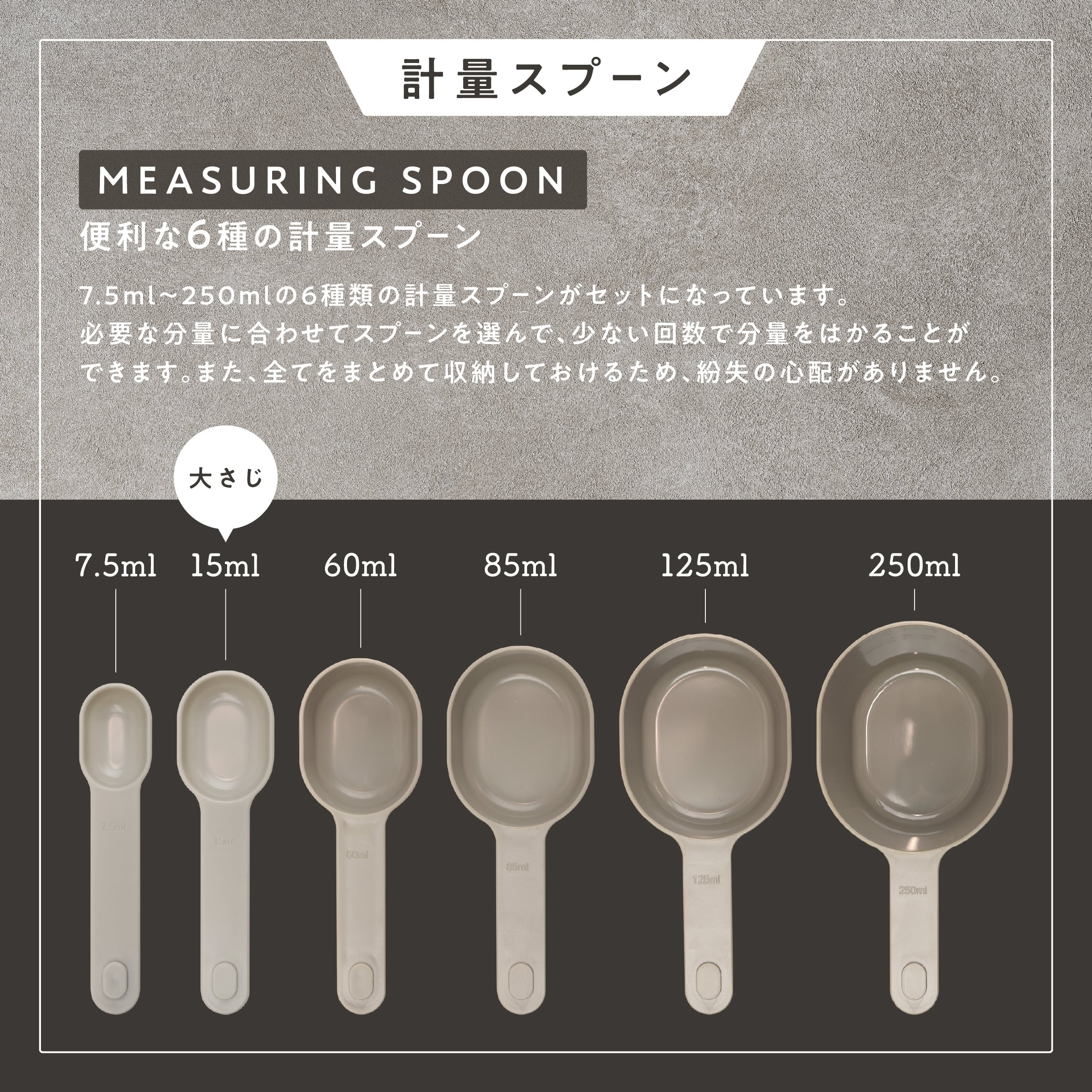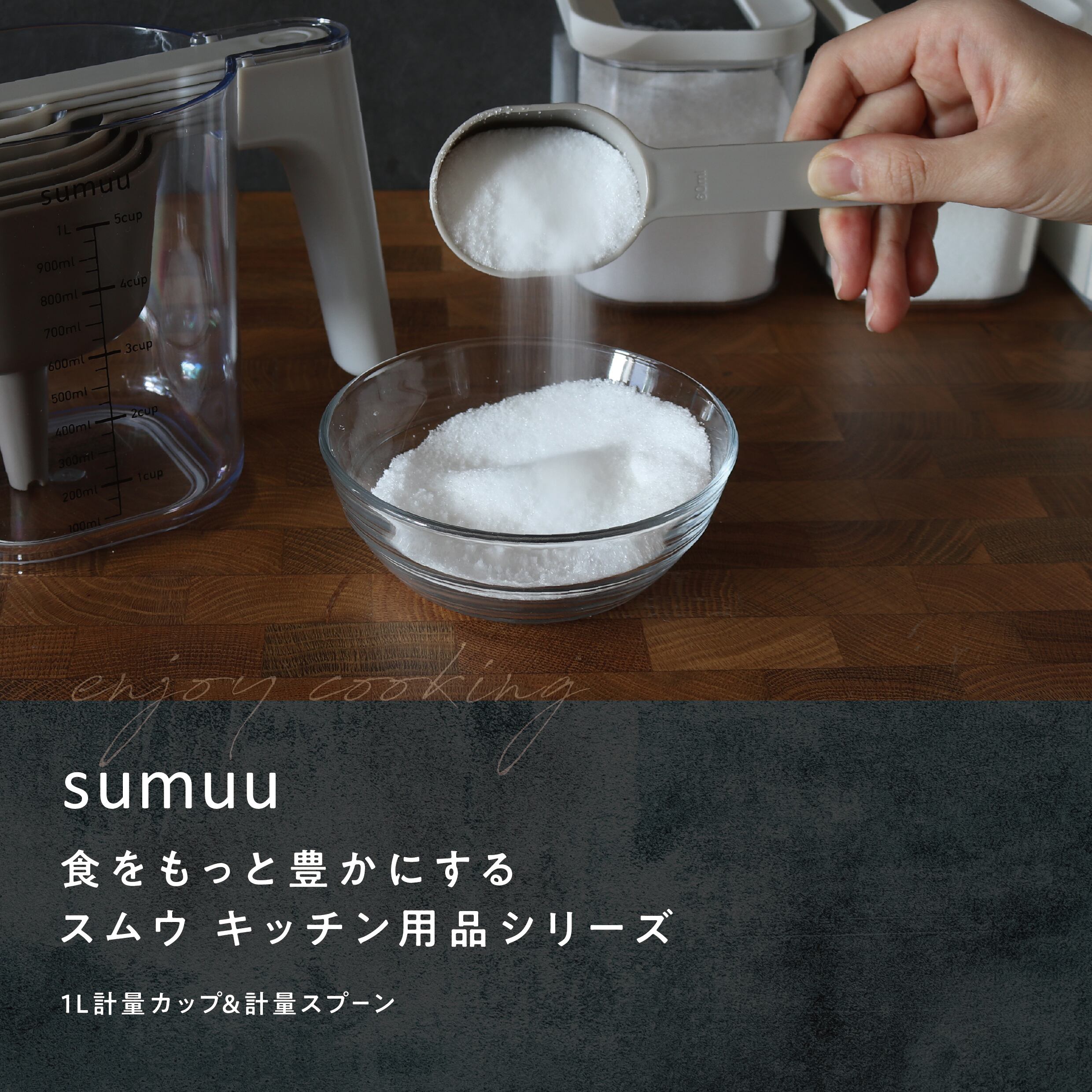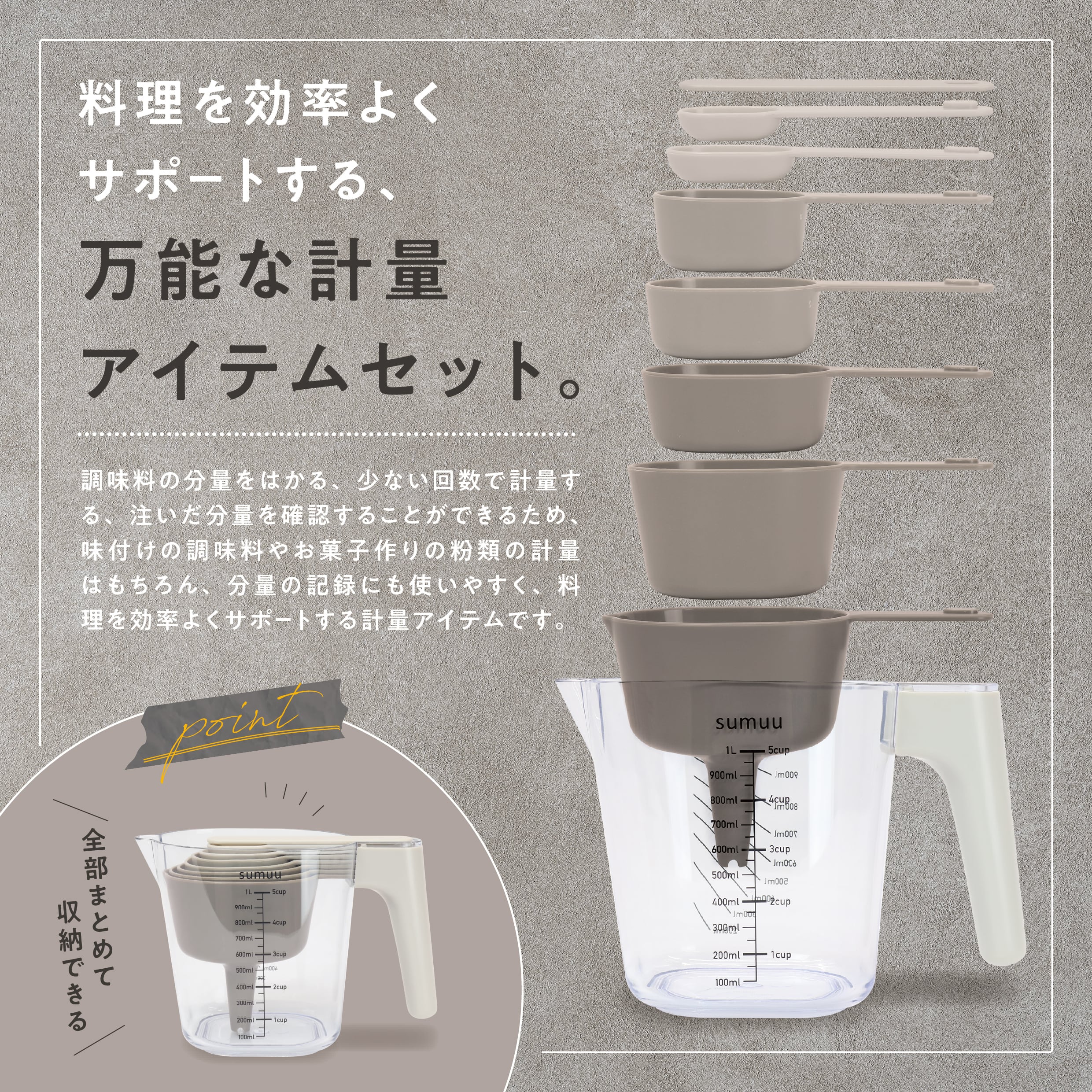 大容量1L計量カップと6種類の計量スプーン、さらに