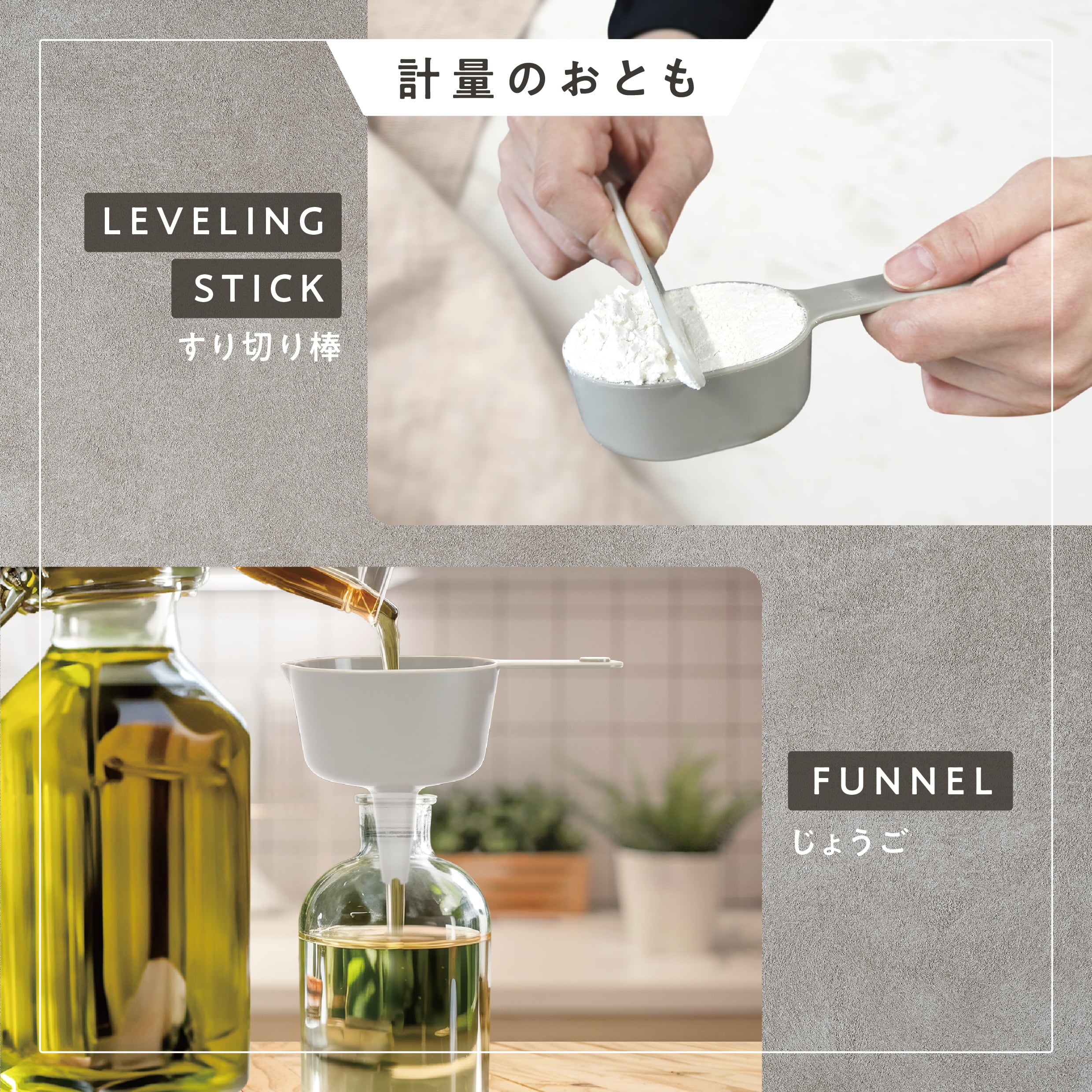 あると便利なすり切り棒とじょうごのセット。
