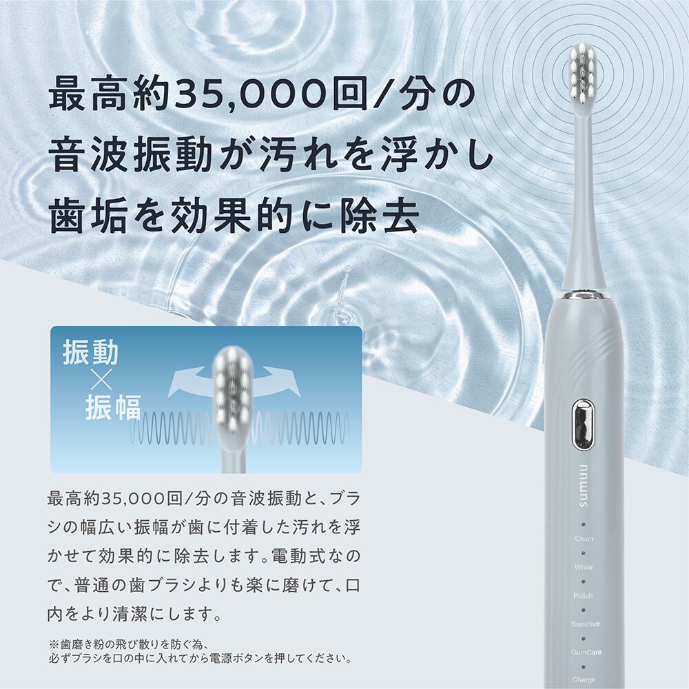 最高約35,000回/分の音波振動が汚れを浮かし、歯垢を効率的に除去。