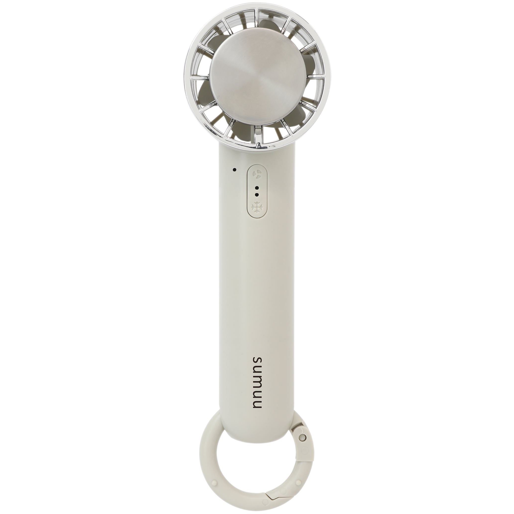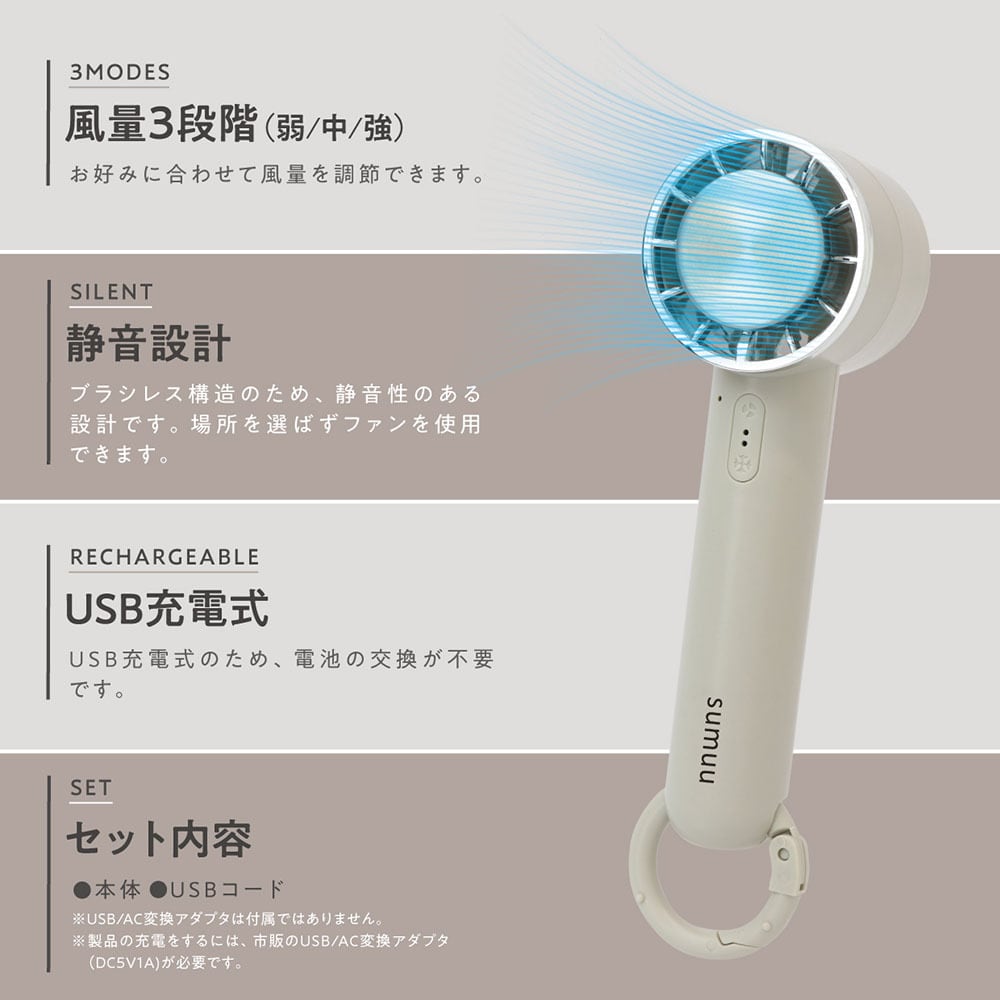 風量3段階調節、ひんやりプレートがついたスマートなハンディファン。スタンドにもなるカラビナ付きで、持ち運びに便利です。